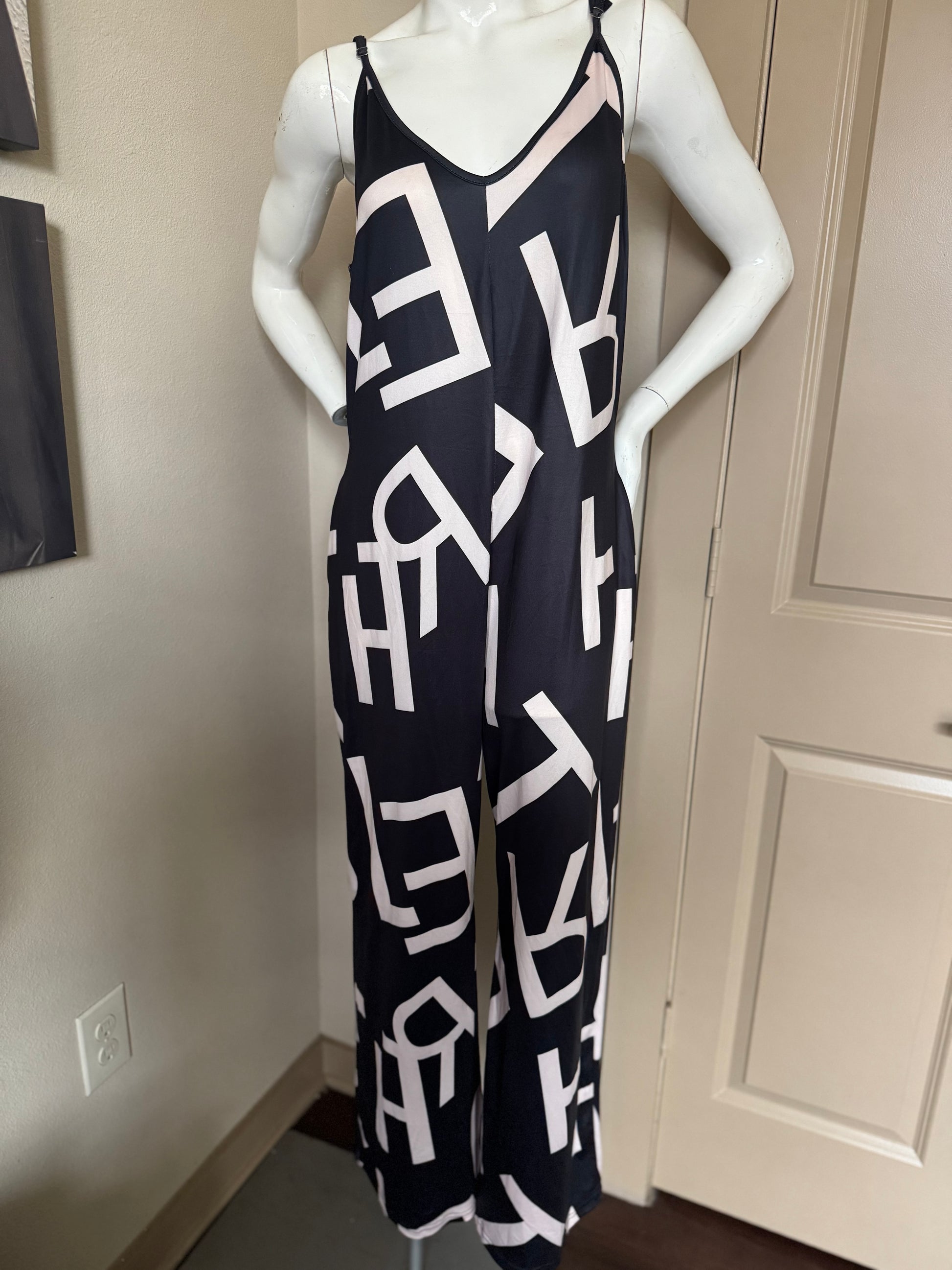 Decode the drip. The Code Breaker jumpsuit makes a power statement with bold abstract typography, a fluid wide-leg silhouette, and adjustable straps for a tailored fit. Lightweight, effortless, and ready for the spotlight. NEW.